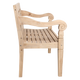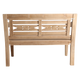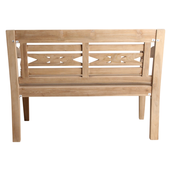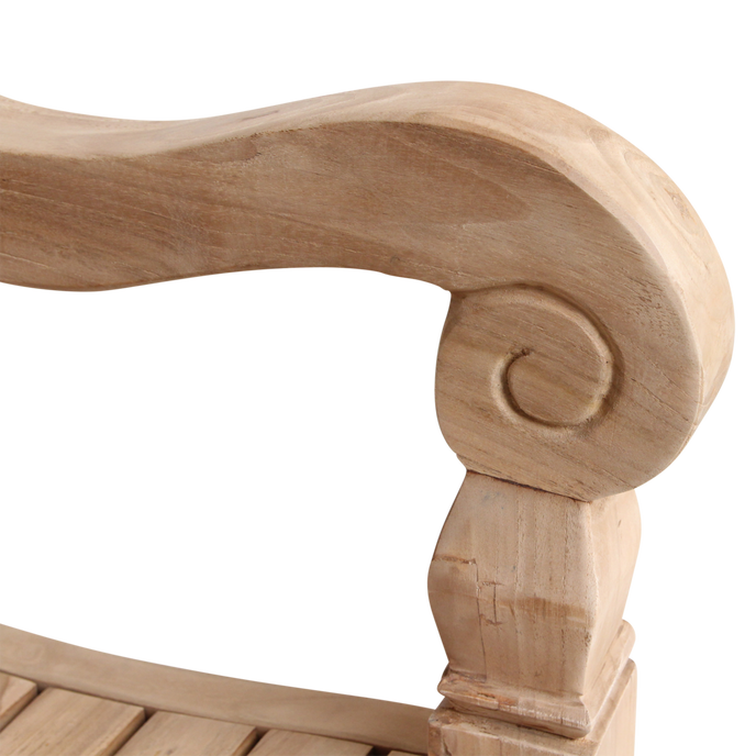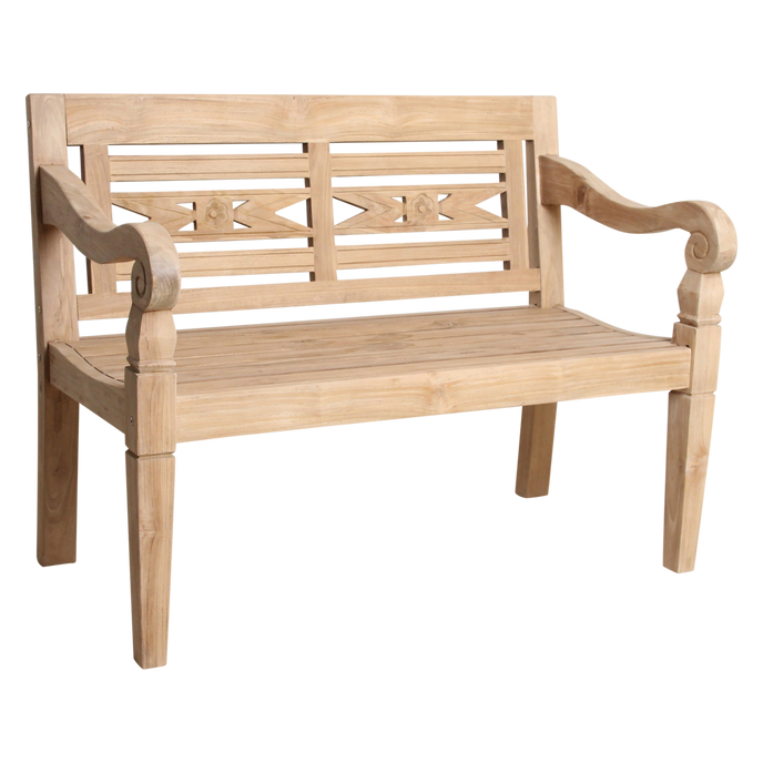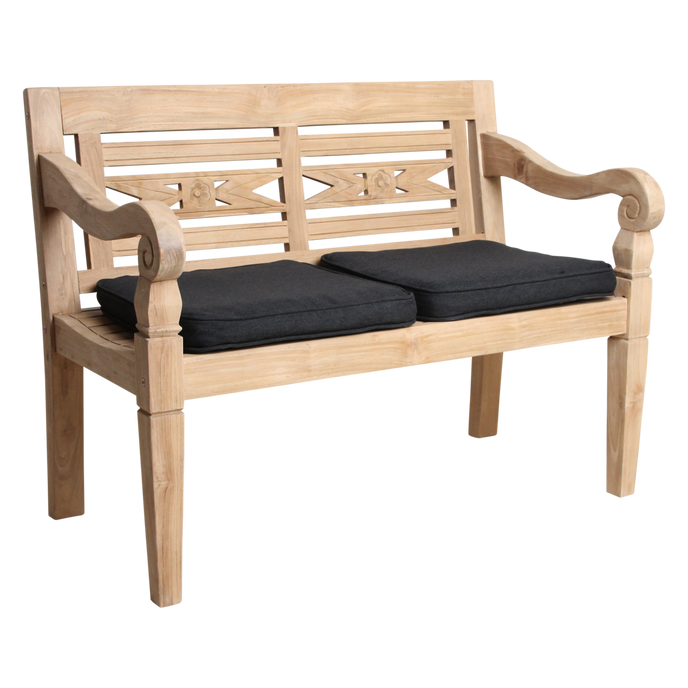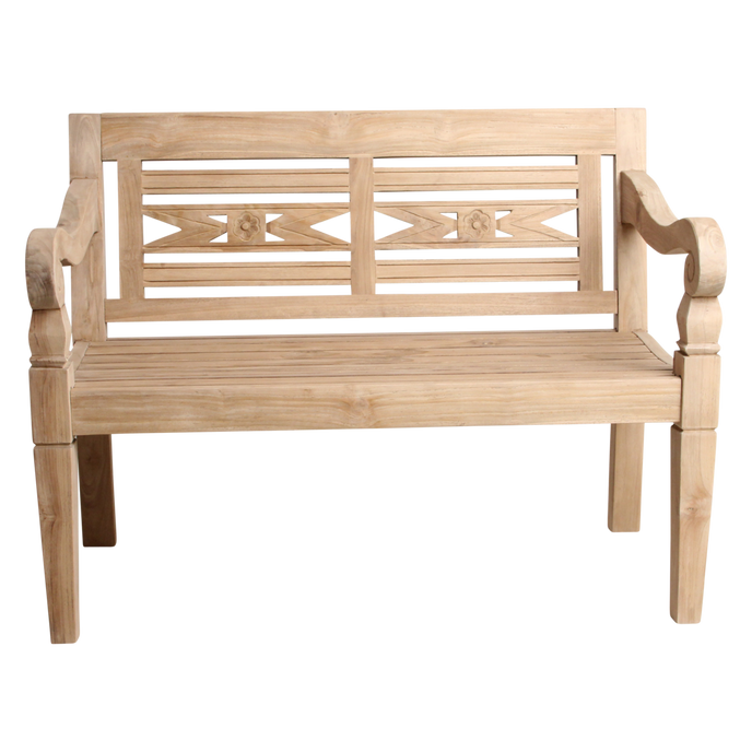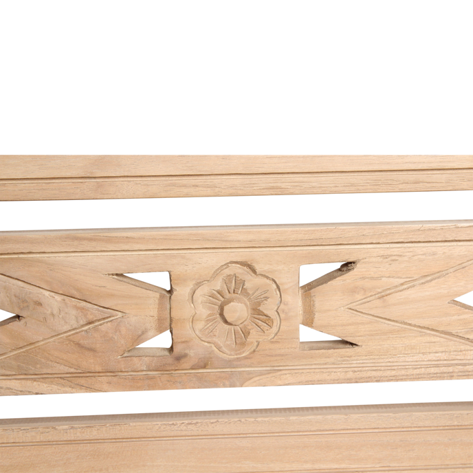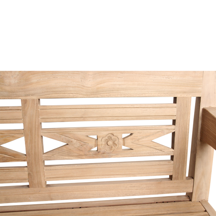 De bank valt op door handgesneden details, zoals bloemen en vormen die doen denken aan Ibiza. Het warme teakhout en de natuurlijke lijnen passen perfect in zowel moderne als traditionele buitenruimtes.