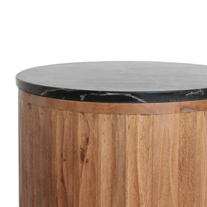 Het ronde blad van zwart marmer is uniek van tekening, geen tafel is hetzelfde. Het mangohouten onderstel behoudt de natuurlijke nerven en ruwe structuur van het hout, wat warmte en leven in de ruimte brengt. Samen zorgen marmer en hout voor een tafel die stevig, zichtbaar natuurlijk en tegelijkertijd stijlvol is. Het hout is afkomstig van mangobomen die na hun vruchtperiode een tweede leven krijgen, waardoor de tafel duurzaam is.