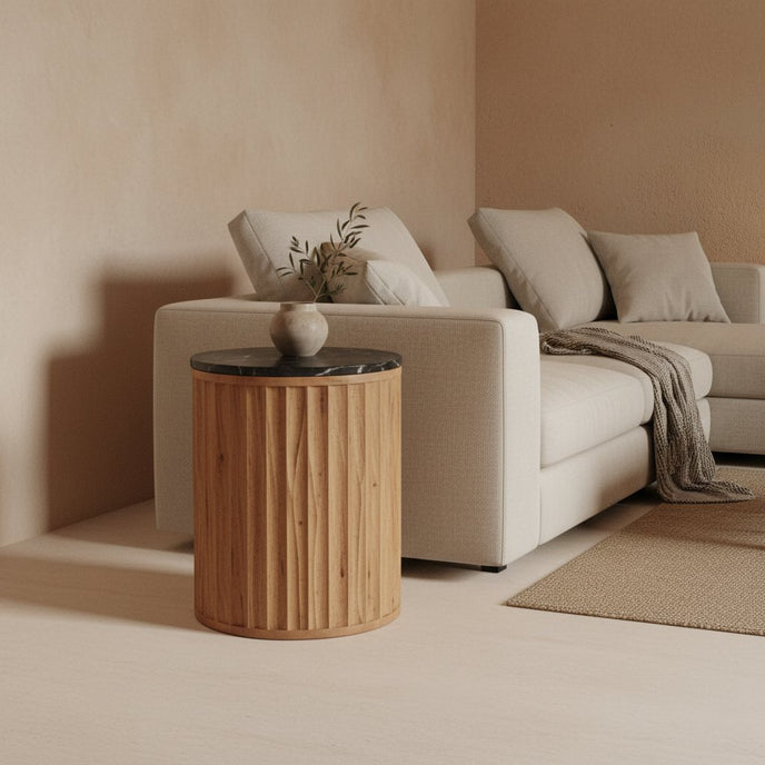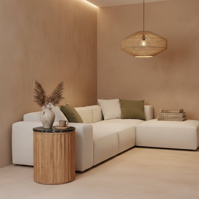 Dankzij het compacte formaat plaats je de Langkawi bijzettafel eenvoudig naast de bank, bij een fauteuil of als losstaand accent in de hal. Het marmeren blad biedt voldoende ruimte voor een glas, een boek of een decoratief object, terwijl het onderstel een warme, organische basis vormt.