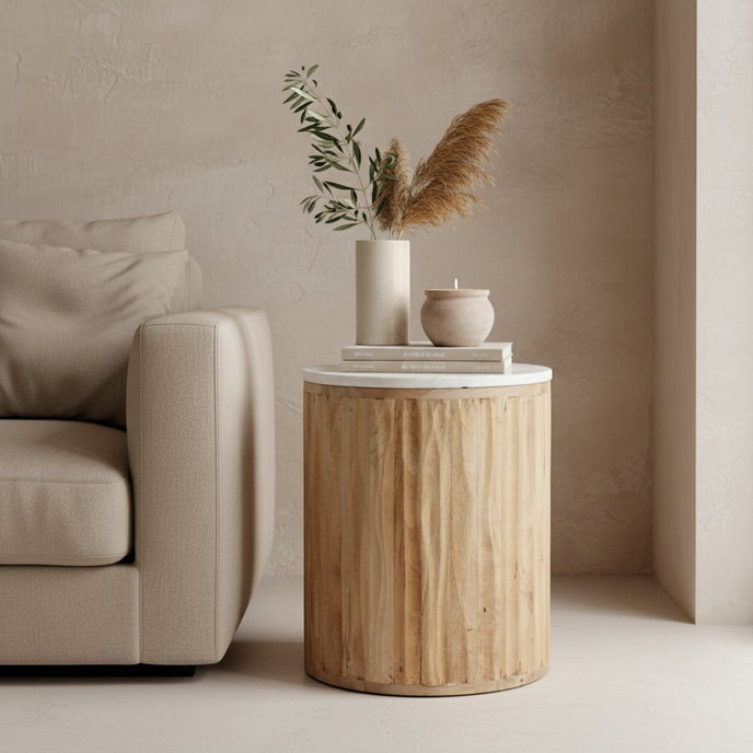 De Malakka bijzettafel marmer wit brengt licht en rust in huis. Het frisse marmer contrasteert subtiel met het warme, natuurlijke mangohout, waardoor de tafel een kalm en evenwichtig karakter krijgt. Een ontwerp dat niet schreeuwt om aandacht, maar vanzelfsprekend zijn plek vindt — ideaal in een modern, Japandi of Scandinavisch interieur.
