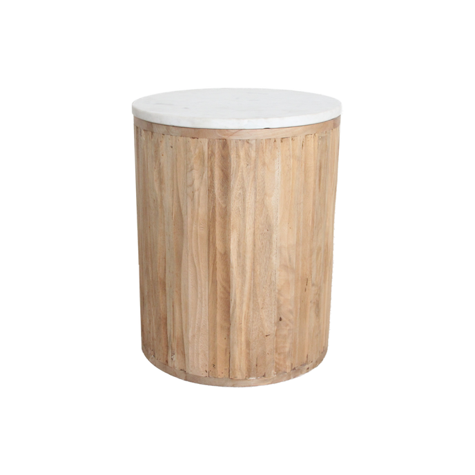 Het ronde blad is gemaakt van wit marmer, waarin zachte grijstinten een rustig patroon vormen. Geen twee bladen zijn hetzelfde; elke tafel draagt zijn eigen tekening. Het mangohouten onderstel voegt warmte toe en laat de natuurlijke houtnerf mooi zien. Het hout is afkomstig van mangobomen die na hun vruchtperiode opnieuw worden gebruikt — een keuze die zowel mooi als verantwoord is.