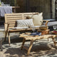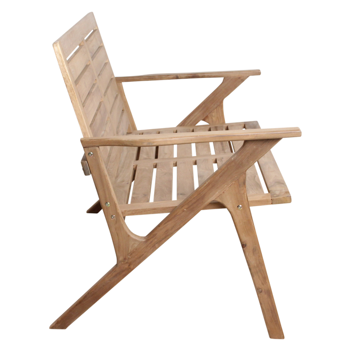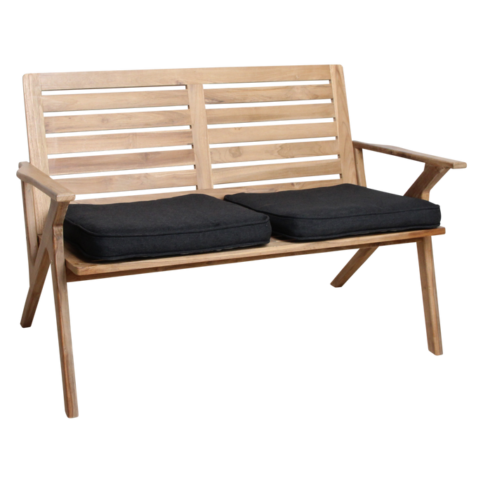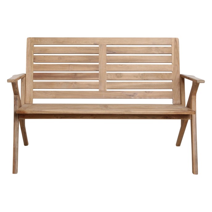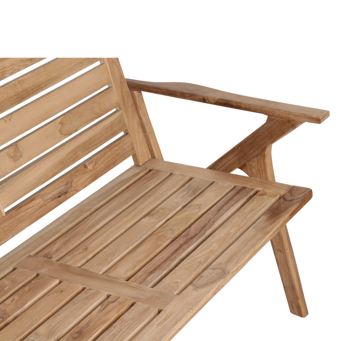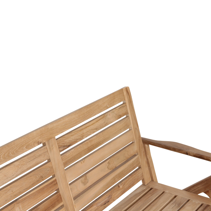 Teakhout zal na verloop van tijd natuurlijk vergrijzen. Wie de warme houtkleur wil behouden, kan de bank behandelen met teakolie. Voor een natuurlijke uitstraling is onderhoud niet nodig; het hout blijft sterk en stijlvol, ongeacht de kleur.