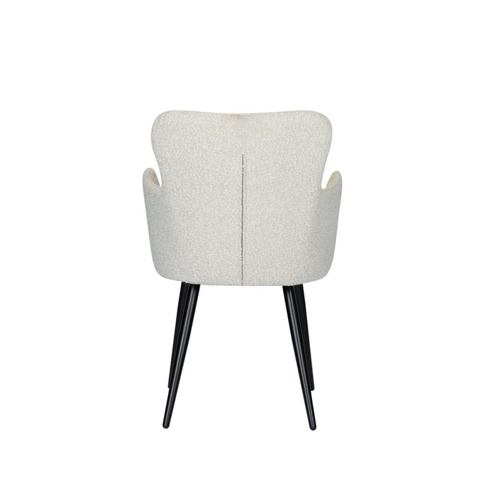 De Wing stoel staat voor comfort. Vernoemd naar de ondersteunende armleuningen. Het is verkrijgbaar in drie kleuren: Sand White, Black en Pear White Boucle. Productafmetingen: Breedte: 58 CM Diepte: 61 CM Hoogte: 87 CM Zithoogte: 48 CM Armhoogte: 69 CM Belangrijke informatie: Geschikt voor dropshipment Montage vereist Originele verpakking 2 stuks / 1 dozen Niet brandvertragend Productmaterialen: Zitting: Multiplex en metalen frame / Schuim 25Kg/M3 / Stof Poten: Zwart gepoedercoat aluminium