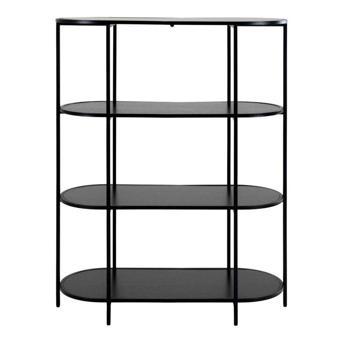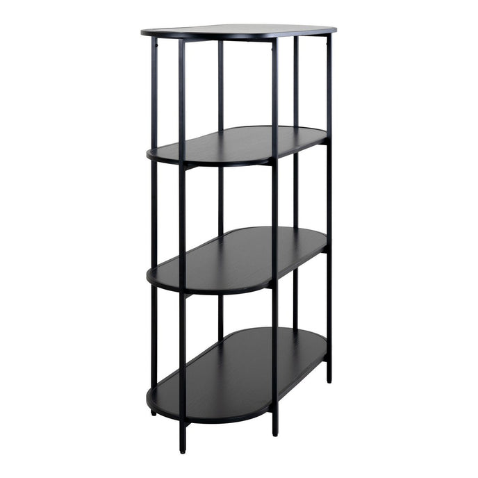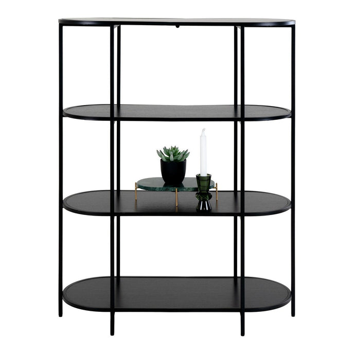 De Vita -plank biedt een stijlvolle en moderne opslagoplossing met vier ovale planken en een strak zwart frame. Dit veelzijdige stuk is perfect voor het weergeven van boeken, decoratieve items of planten in elke woonkamer, slaapkamer of thuiskantoor.